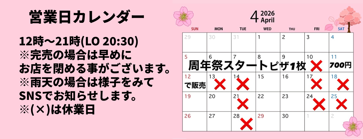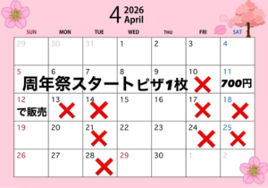 4/5〜4/12までピザ1枚700円で販売いたします!